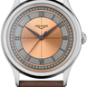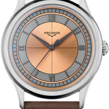 The AS06 Salmon features a sunburst salmon dial contrasted by matte grey hour and minute sectors. The Roman numeral indexes and faceted alpha hands are coated in anthracite PVD (dark gun). The domed sapphire crystal enhances the whole.