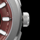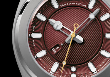 Embodying elegance and sportiness, the Belvedere Bordeaux captivates with its deep, luxurious red. This unique hue not only stands out but also exudes a sense of rarity and sophistication, making it highly desirable. The dial features a luminous golden second hand and Super-LumiNova-filled indices, highlighting the meticulous craftsmanship and attention to detail that defines Carl Suchy & Söhne.