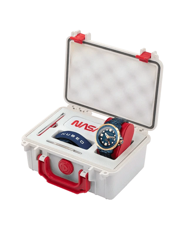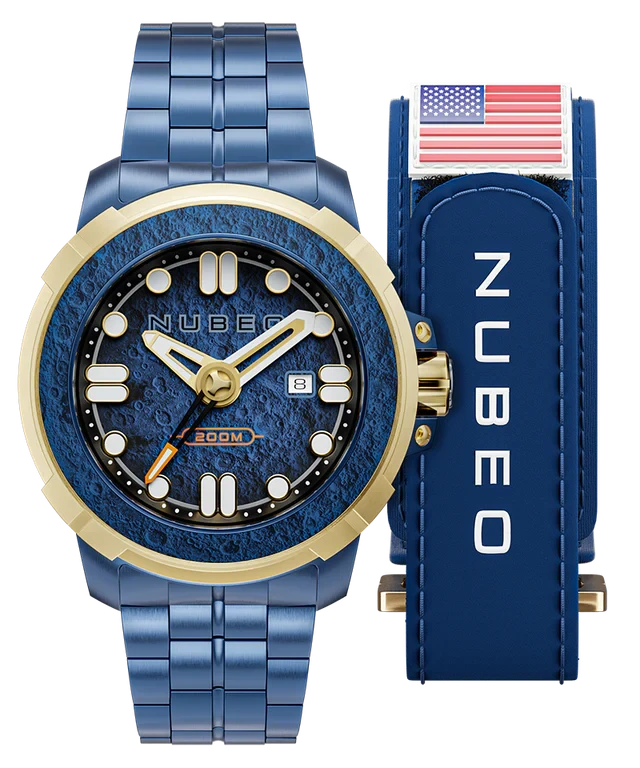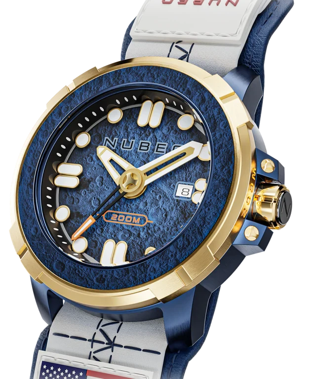 The moon-inspired forged bezel captures the essence of NASA's lunar exploration. The Apollo Automatic Limited Edition embodies endurance, character, and meticulous detail, celebrating a groundbreaking moment in our understanding of the Universe. Its case back features an authentic lunar meteorite. With an additional nylon strap, this timepiece offers comfort and versatility in any situation.