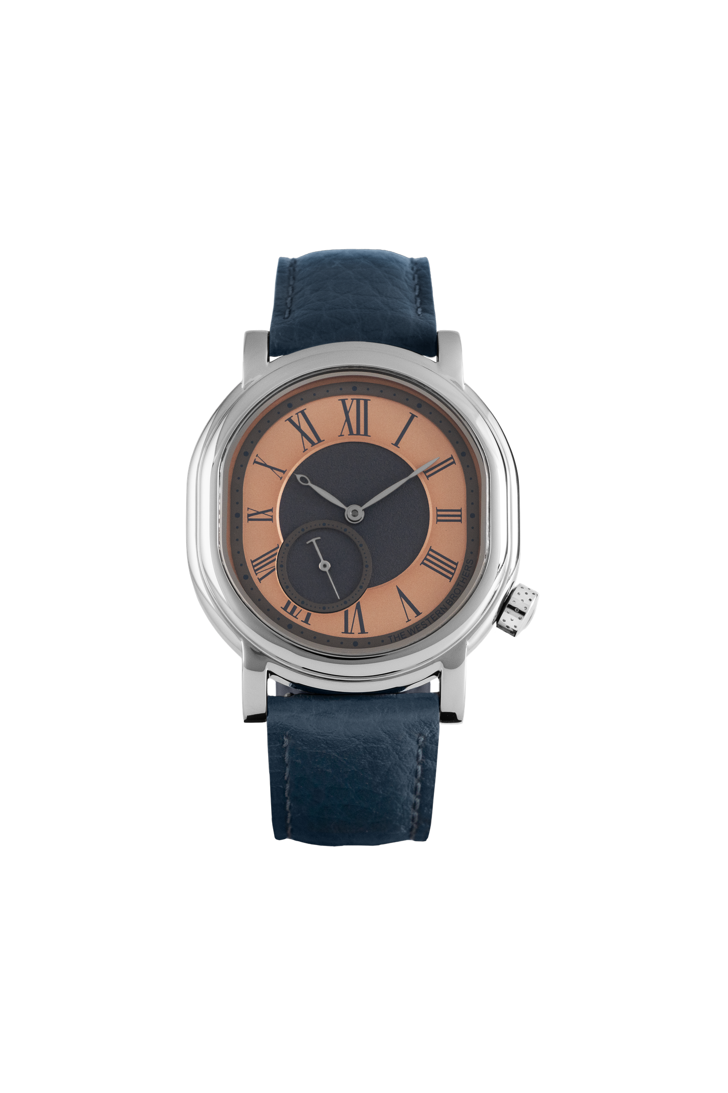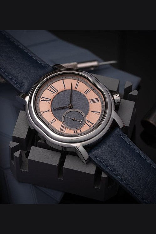 The striking navy blue-on-salmon dial creates a unique contrast, blending warm copper hues with cool, deep tones. Roman numeral hour markers and a textured guilloché pattern add depth and character to the design.