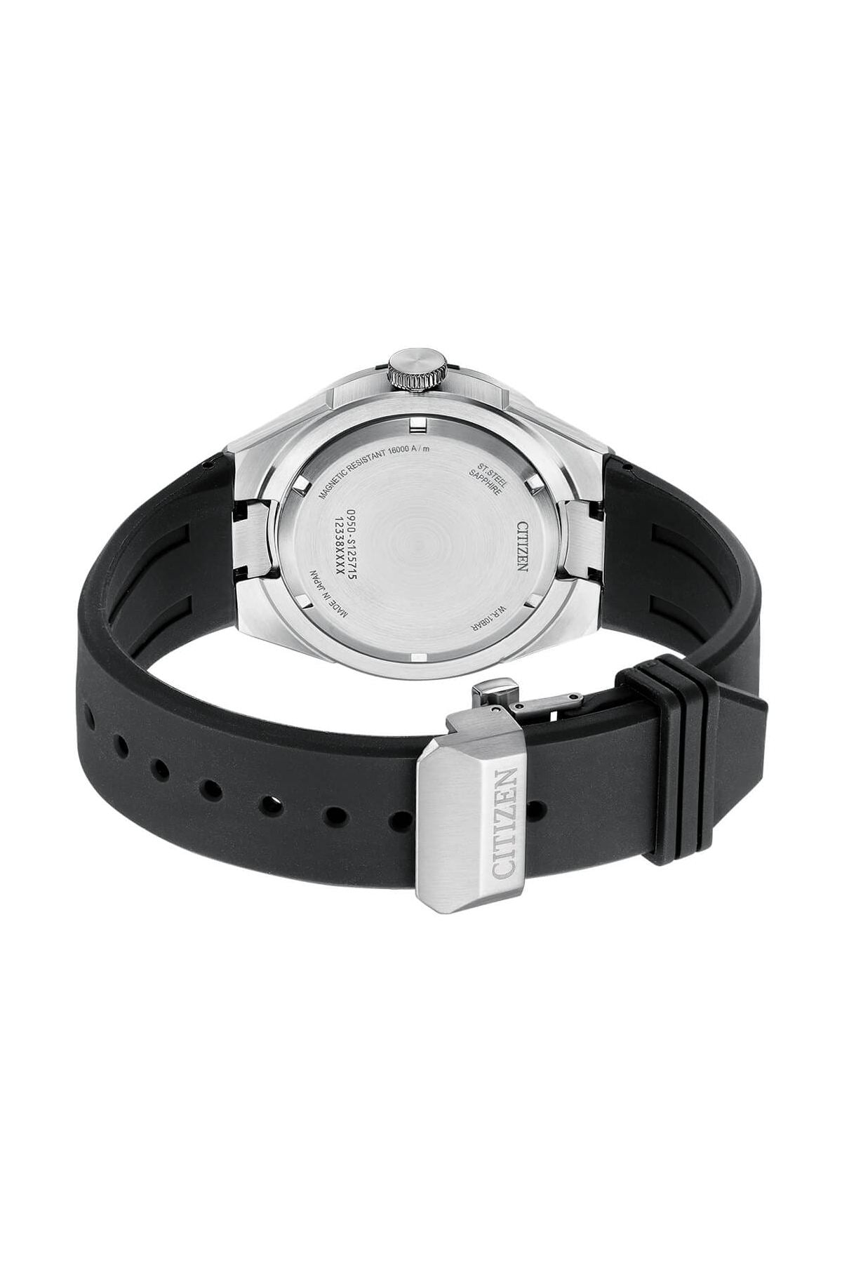 Bold and Simple. This timepiece offers functionality and practicality and features an eye-catching two-piece stainless-steel bezel finished with Duratect DLC, diamond-like ceramic case, black polyurethane resin strap, lightweight and durable black carbon dial. Additional features include exhibition case back, magnetic resistance, sapphire glass with anti-reflective coating, 50-hour power reserve and water resistance of 100 meters.