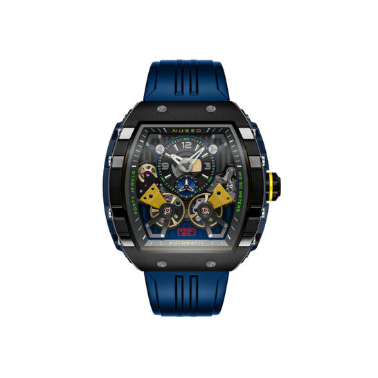 The Magellan Double Barrel Automatic is powered by a self-winding double barrel movement, showcasing the hour and minute display at the top of the dial and a subdial seconds display at the 6 o’clock position. The double barrels, positioned at 5 and 7 o’clock, add intricate mechanical detail, creating a watch that is as visually captivating as it is technically impressive. Black stainless steel case with a blue rubber strap. Fixed black stainless steel bezel. Blue dial with silver-tone hands and index hour markers. Minute markers around the outer rim. Dial Type: Analog. Luminescent hands and markers. M-PTS-S05A automatic movement. Scratch resistant mineral crystal. Screw down crown. Transparent case back. Tonneau case shape, case size: 48 mm, case thickness: 19 mm. Band width: 26 mm, band length: 8 inches. Water resistant at 50 meters / 165 feet. Functions: hour, minute, second. Magellan Series. Casual watch style. Nubeo Magellan Automatic Blue Dial Men's Watch