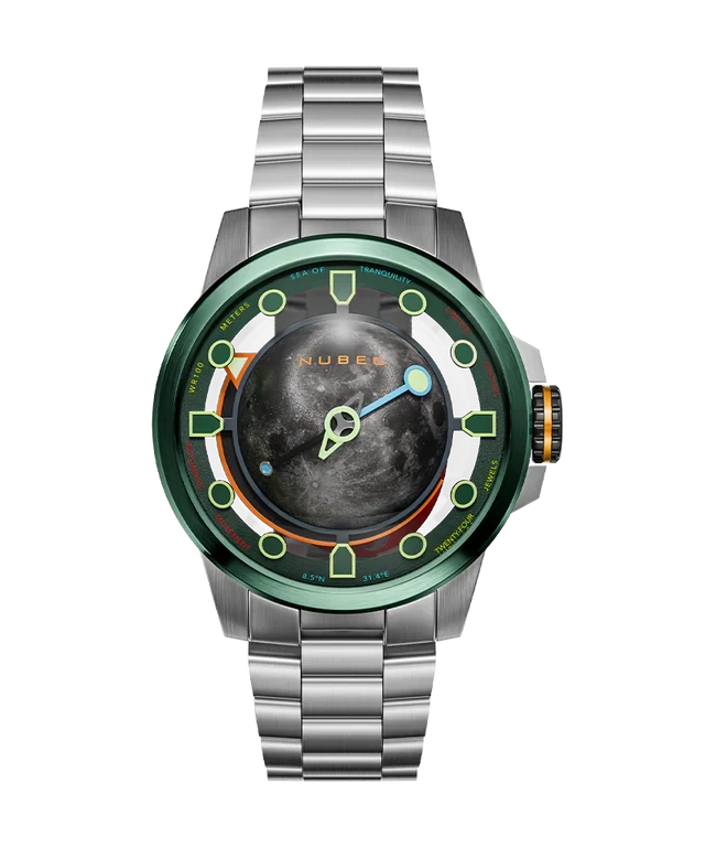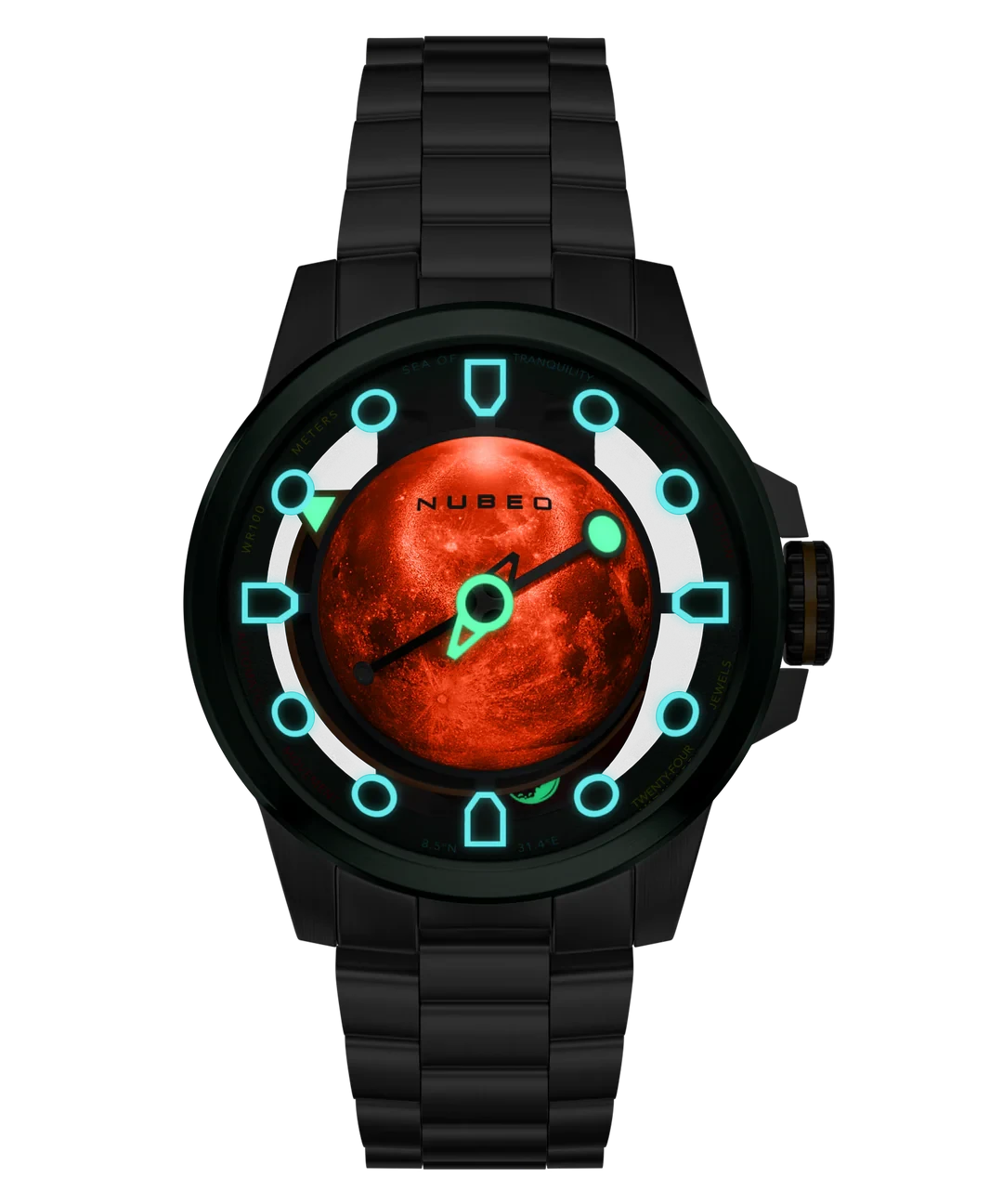 Mare Tranquillitatis, the landing site of Apollo 11 in 1969, serves as the inspiration for this extraordinary timepiece. The Tranquility features a standout 3-dimensional domed dial that echoes the curvature and profile of the moon. Each dial is individually 3-D printed with luminous resin, resembling a planetarium and offering a unique timekeeping experience.
