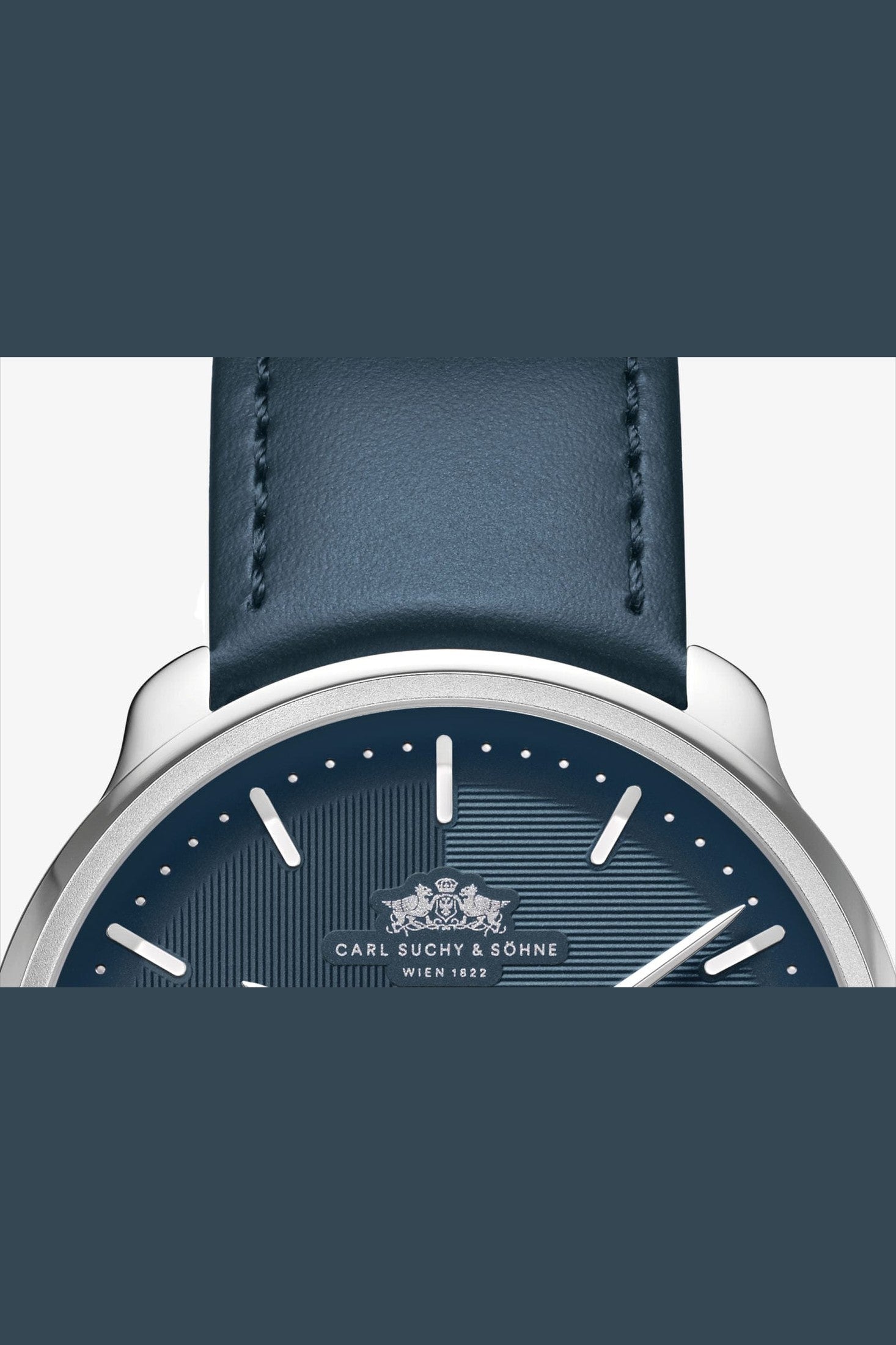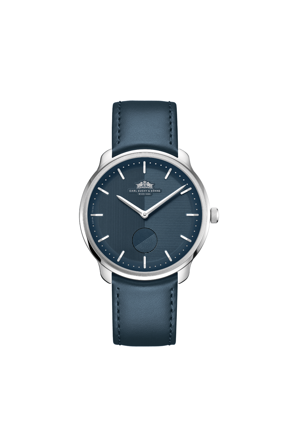 Blue like the Viennese Danube – the Waltz N°1 Blue Danube is the unique blue steel watch by Carl Suchy & Söhne. The mechanic watch with a longstanding Austrian legacy is handcrafted in Switzerland in strictly limited production series. The high-quality dress watch is characterized by clear lines and minimalist design, inspired by Viennese Modernism.