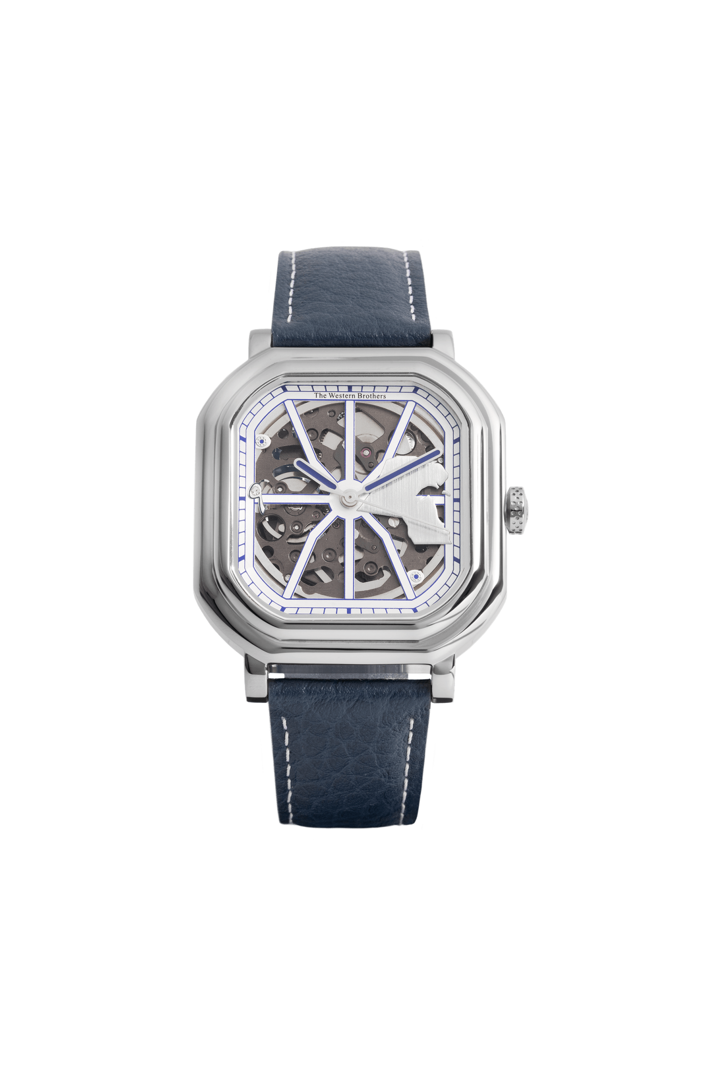 Its striking skeleton dial reveals the intricate inner workings of its automatic movement, while the iconic Kuwait map engraving adds a meaningful touch to the design. The bold white and blue detailing reflects the colors of the Kuwaiti identity, enhancing its unique aesthetic.