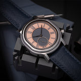 The striking navy blue-on-salmon dial creates a unique contrast, blending warm copper hues with cool, deep tones. Roman numeral hour markers and a textured guilloché pattern add depth and character to the design.