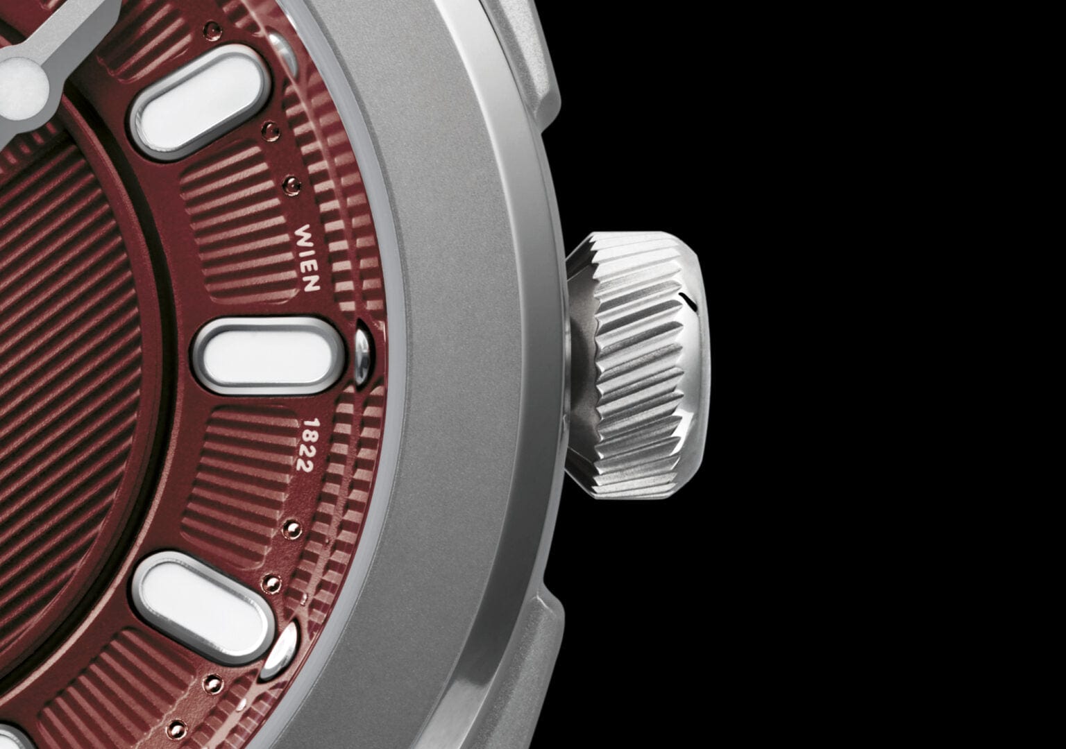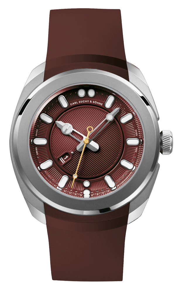 Embodying elegance and sportiness, the Belvedere Bordeaux captivates with its deep, luxurious red. This unique hue not only stands out but also exudes a sense of rarity and sophistication, making it highly desirable. The dial features a luminous golden second hand and Super-LumiNova-filled indices, highlighting the meticulous craftsmanship and attention to detail that defines Carl Suchy & Söhne.