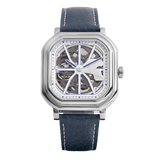 Its striking skeleton dial reveals the intricate inner workings of its automatic movement, while the iconic Kuwait map engraving adds a meaningful touch to the design. The bold white and blue detailing reflects the colors of the Kuwaiti identity, enhancing its unique aesthetic.