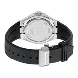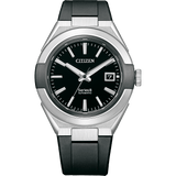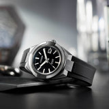Bold and Simple. This timepiece offers functionality and practicality and features an eye-catching two-piece stainless-steel bezel finished with Duratect DLC, diamond-like ceramic case, black polyurethane resin strap, lightweight and durable black carbon dial. Additional features include exhibition case back, magnetic resistance, sapphire glass with anti-reflective coating, 50-hour power reserve and water resistance of 100 meters.