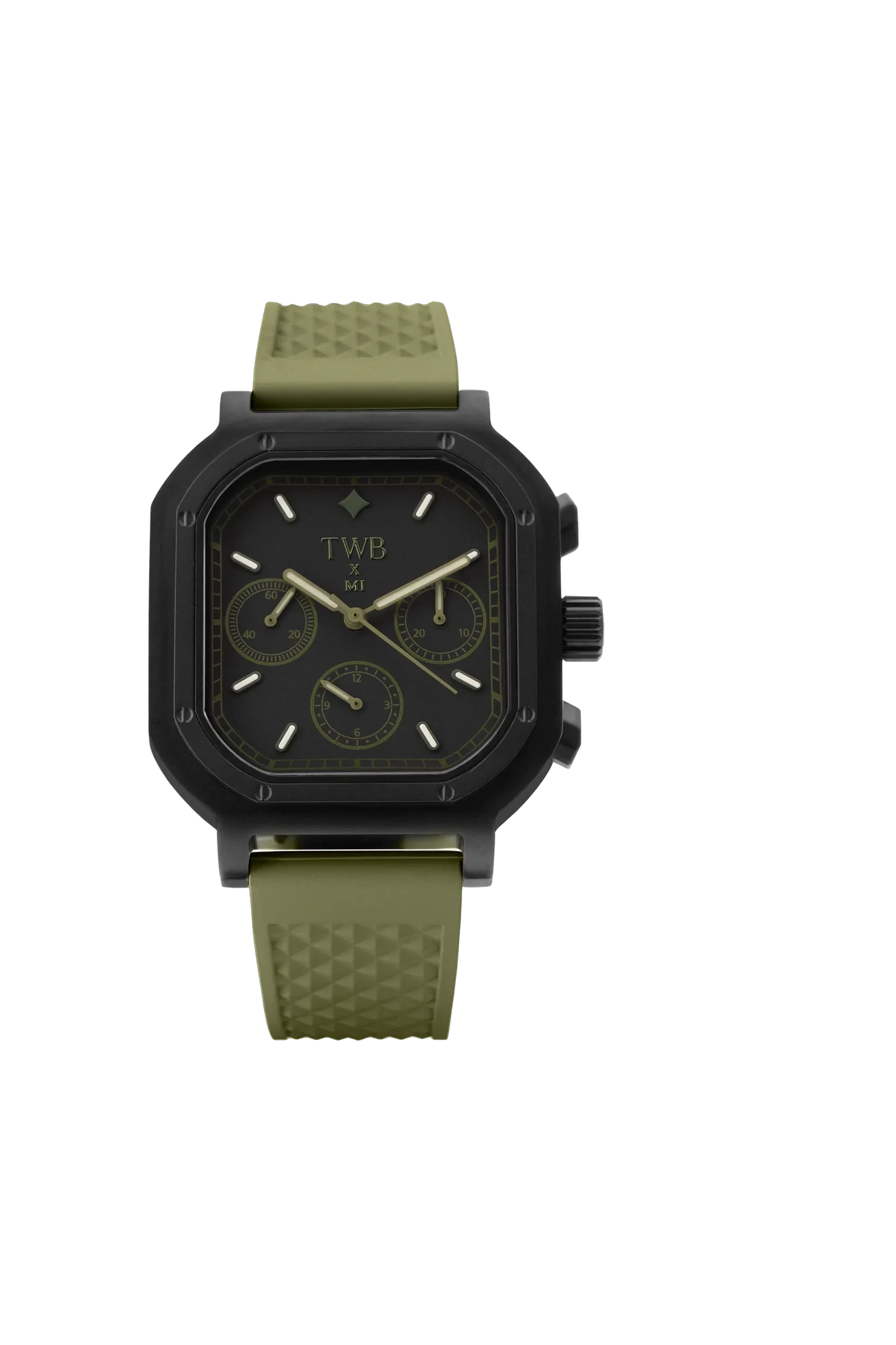 Inspired by rugged elegance, the Sportalia MI Edition Chronographcombines bold design with precision engineering. Its matte black 316 stainless steel case is paired with an olive green-on-black dial, creating a refined yet powerful aesthetic.