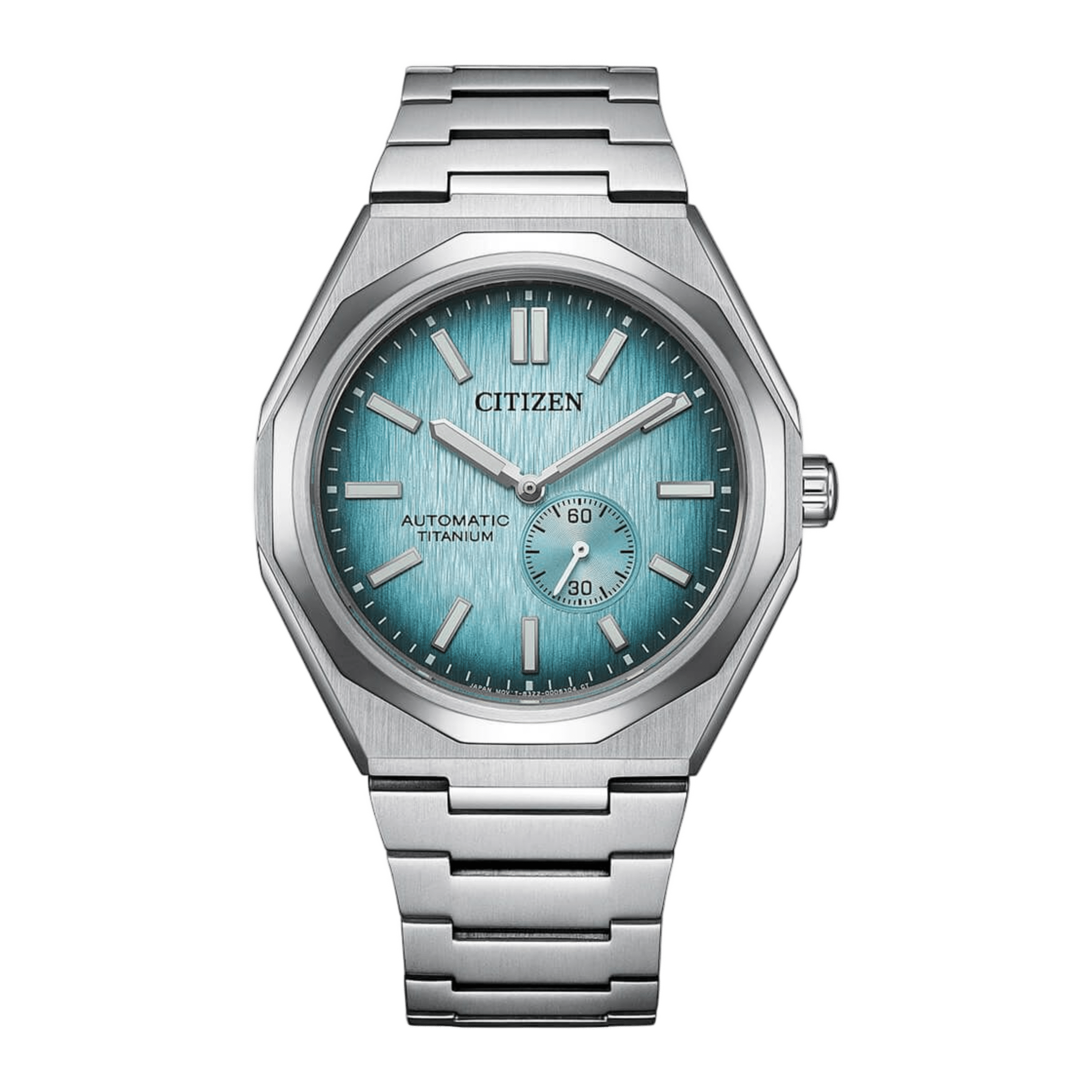 The Zenshin 60 pairs classic proportions with modern sport styling, crafted in CITIZEN’s proprietary Super Titanium™ that is five times harder and 40 percent lighter than stainless steel while being resistant to scratches and corrosion. The 40.5 mm case features refined brushed and polished finishing and is complemented by an integrated matching bracelet for a seamless look. Beneath the sapphire crystal lies a gradient ice blue dial accented with a white outer minute track, luminous hands, silver tone markers, and an off center sub dial that provides a unique display of running time. Powered by an automatic movement, the watch delivers a 60 hour power reserve for lasting performance. It is water resistant to 100 meters. At its core is Caliber 8322, showcasing precision and craftsmanship in a contemporary timepiece.